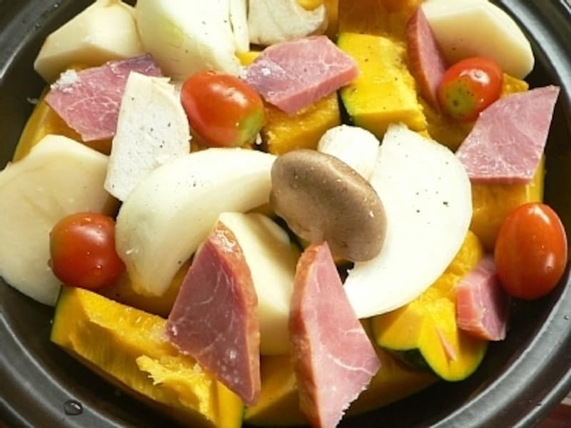 - タジン鍋に堅い野菜を並べ、トマトとエリンギをのせ、白ワインと水を回し入れ、塩コショウし、オリーブオイルを回しかけ、蓋をして中火にかける。グツグツ煮立ってきたら弱火にして、蒸し焼きにする。