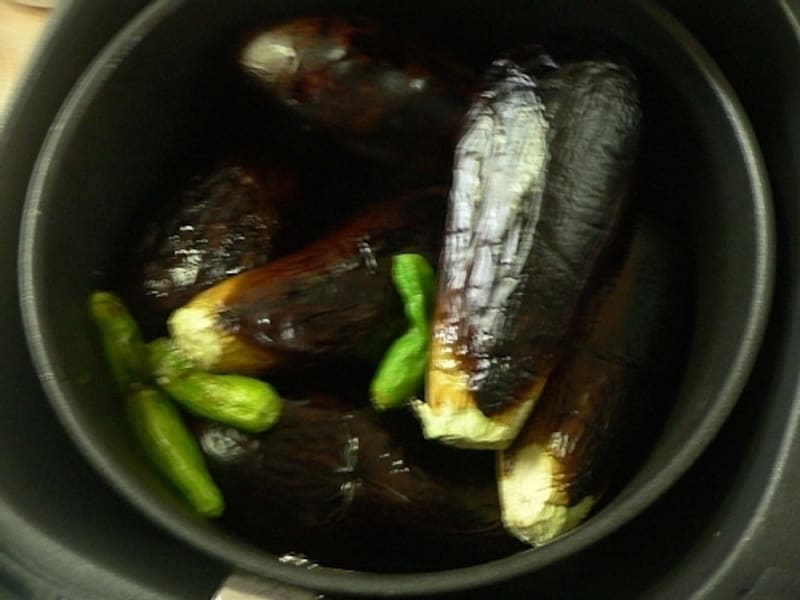 - 茄子のヘタを切り落としてボウルに入れ、サラダ油を少々かけて、ボウルを上下に振って、全体にまぶし、ノンオイルフライヤーで15~17分焼く。途中で上下を入れ替えて満遍なく焼けるようにする。
