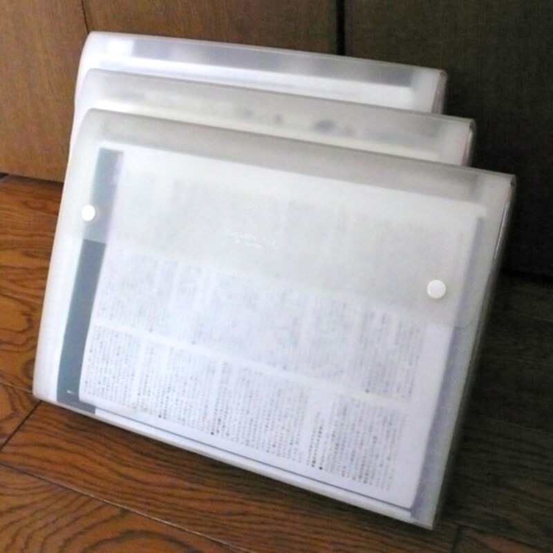 文房具屋さん、ホームセンター、最近では100円ショップでも手に入るかもしれませんが、どこのものでも構いません。値段もピンキリで、200~800円くらいまでいろいろあるようですが、重要なのは蛇腹式、かつ透明もしくは半透明で、中身が見えることです。