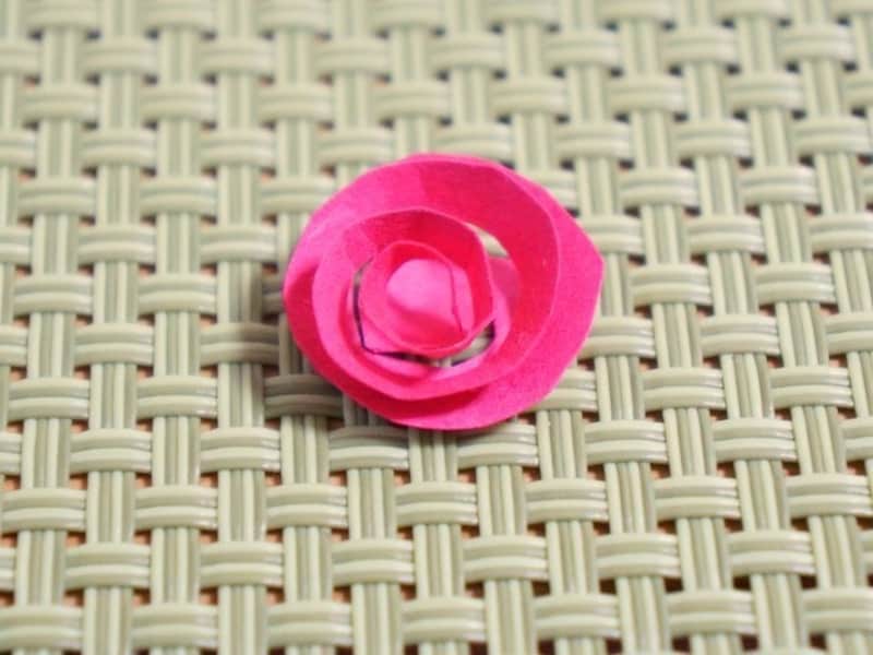その上にリボンを貼ります。 - 画用紙で作ったバラを5つ両面テープで貼ります。