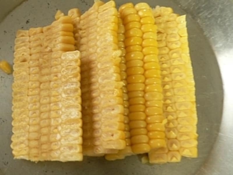 - トウモロコシは長さを半分に切って立て、包丁で実をはがすように切り取る。