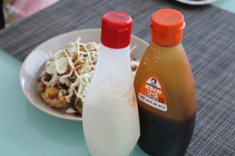 その上から格子状にお好み焼きソースとマヨネーズをかけて完成