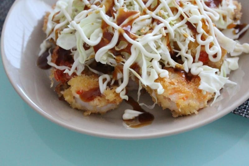 お好み焼き風のエビフライです。キャベツは生のまま。メニューに忠実に作ってみました。