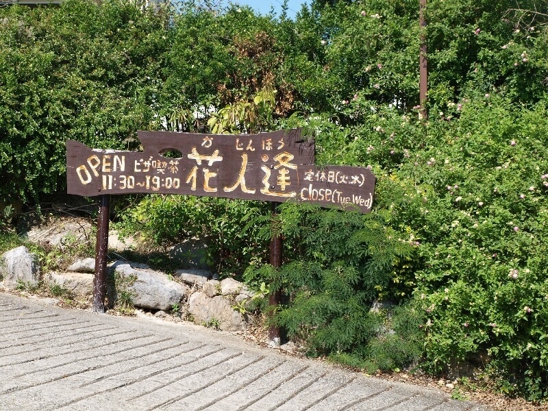 真っ青な空と海が眼下に広がる「花人逢」は手作りの美味しいピザが楽しめる喫茶です。