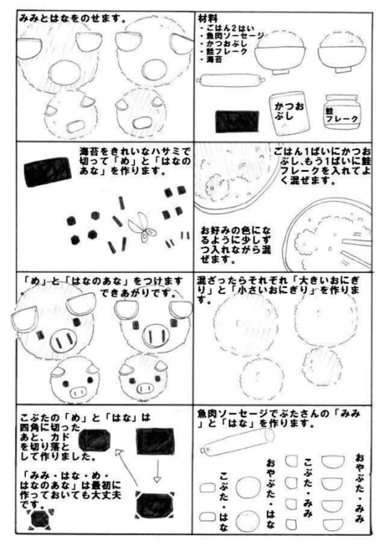・こぶた「はな」(長四角に切ってカドを落としたもの2つ) - みみとはなをおにぎりにのせます。