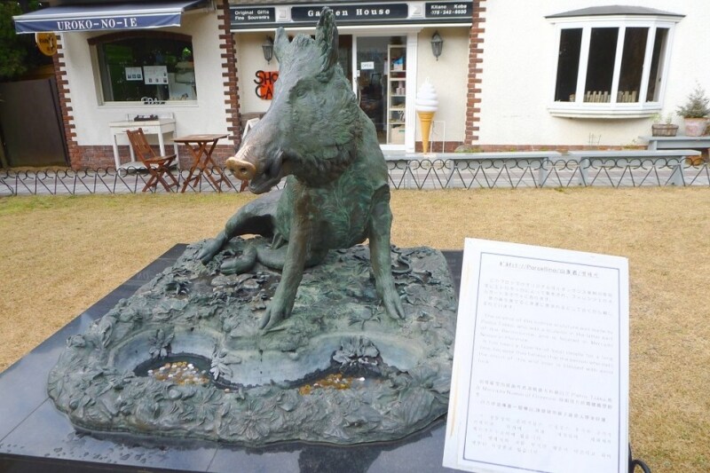 坂をのぼった見晴らしのよいところにあるうろこの家。門をくぐってすぐのお庭の真ん中に座っているイノシシの像、「ボルチェリーノ」が最初のポイントです。この像の鼻に触ると幸運を呼ぶと言われています!