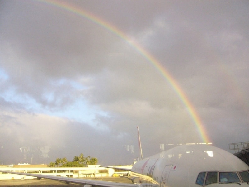 ハワイでは虹がよくでると有名なので、時々、空を見上げるようにしていました。すると、帰国間際の空港で、見ることができたのです。帰国するのはさみしかったものの、虹が見れたので、しあわせな気持ちになったものです。