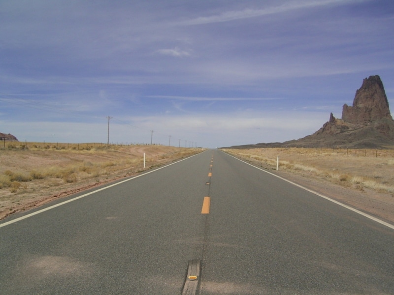 モニュメント・バレーは、フラッグスタッフ空港から約180マイル(約290キロ)のところにあります。公共交通機関がないため、車でハイウェイをただただ北上します。どこまでも真っ直ぐと延びる一筋の道は、まるで時空を超えタイムスリップしているかのようです。広大な砂漠に突如として現れる巨大なモニュメントに思わず声を失います。