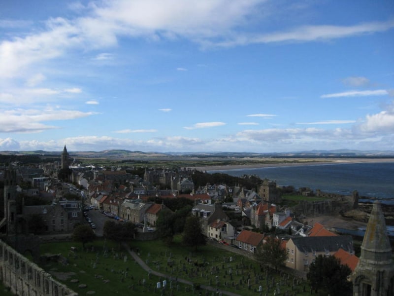 スコットランドの首都エディンバラからさらに北に向かい、鉄道がない、海に面した町がセントアンドリュースです。町は少し坂になっていますが、絶景ポイントはシンボルでもある尖塔、聖ルール塔からの眺めです。