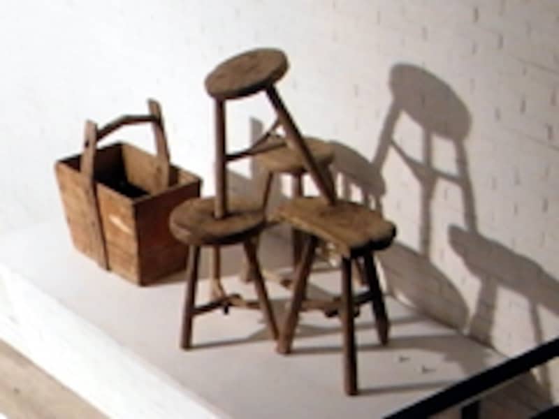 地上階からつながる鉄骨の階段から眺めた1階フロアー模様です。1階と2階の間、キャットウォークのような梁の上に置かれた古い素朴な椅子に注目です。今にも壊れそうな椅子がつくるシルエットが美しく、息を呑み感動。最上階の家具フロアーに期待が膨らみます。