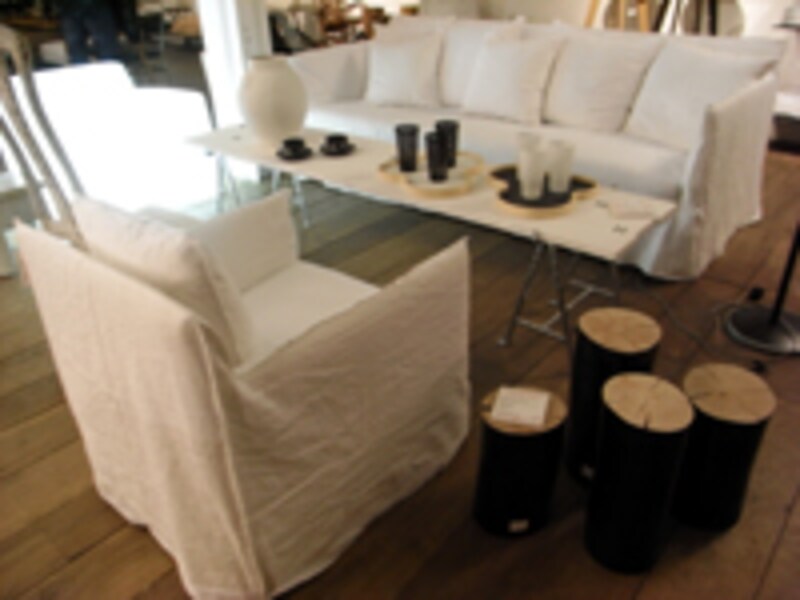 淡々と無造作に、白い Paola Navone(パオラ・ナヴォーネ)の世界が置かれていました。日本ではあまり目にすることができないイタリアの“Gervasoni(ジェルバゾーニ)”社のファニチャーや照明器具、スツールなどが何のてらいもなく、あちこちで他社のものとコーディネートされています。写真の樹の樹皮に黒のエナメル塗装した“log(丸太)と名付けられたスツールも商品です。“Sweet40”と名付けられた不思議なニットのおオットマンは、Martin Churaba(マルティン・チェルバ) アルゼンチンのデザイナーの作品です。