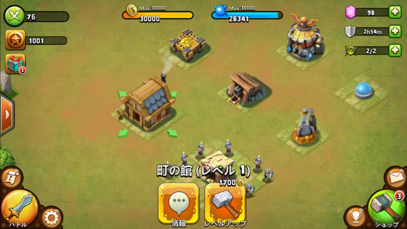 ゲームの進行に不可欠な自分の施設。軍キャンプや町の館など重要な施設はできる限り建設しておき、攻撃に備えて装備しておく必要があります。