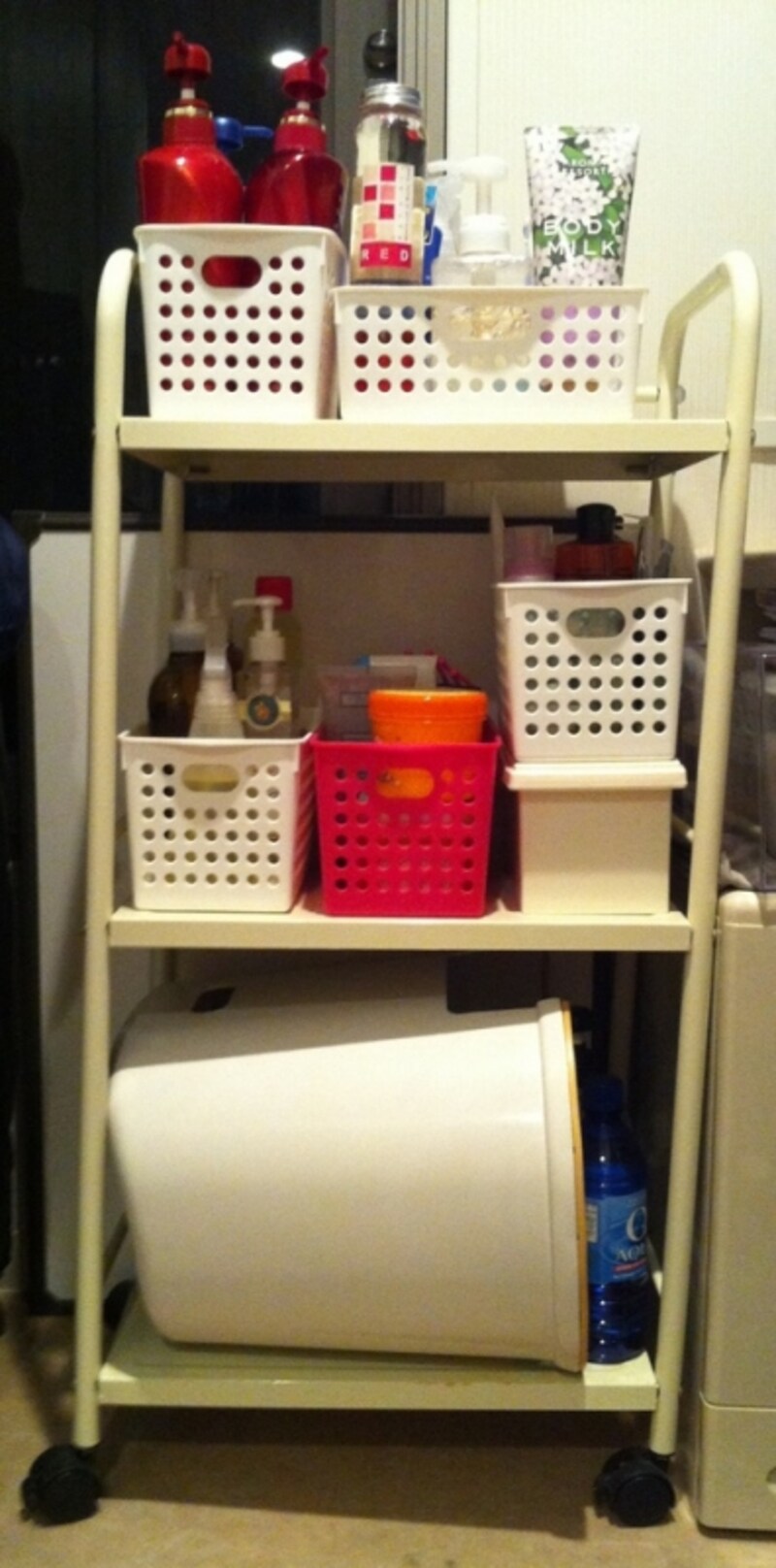 我が家では使う都度、自分用のアメニティボックスをバスルームそばに置いてあるワゴンから