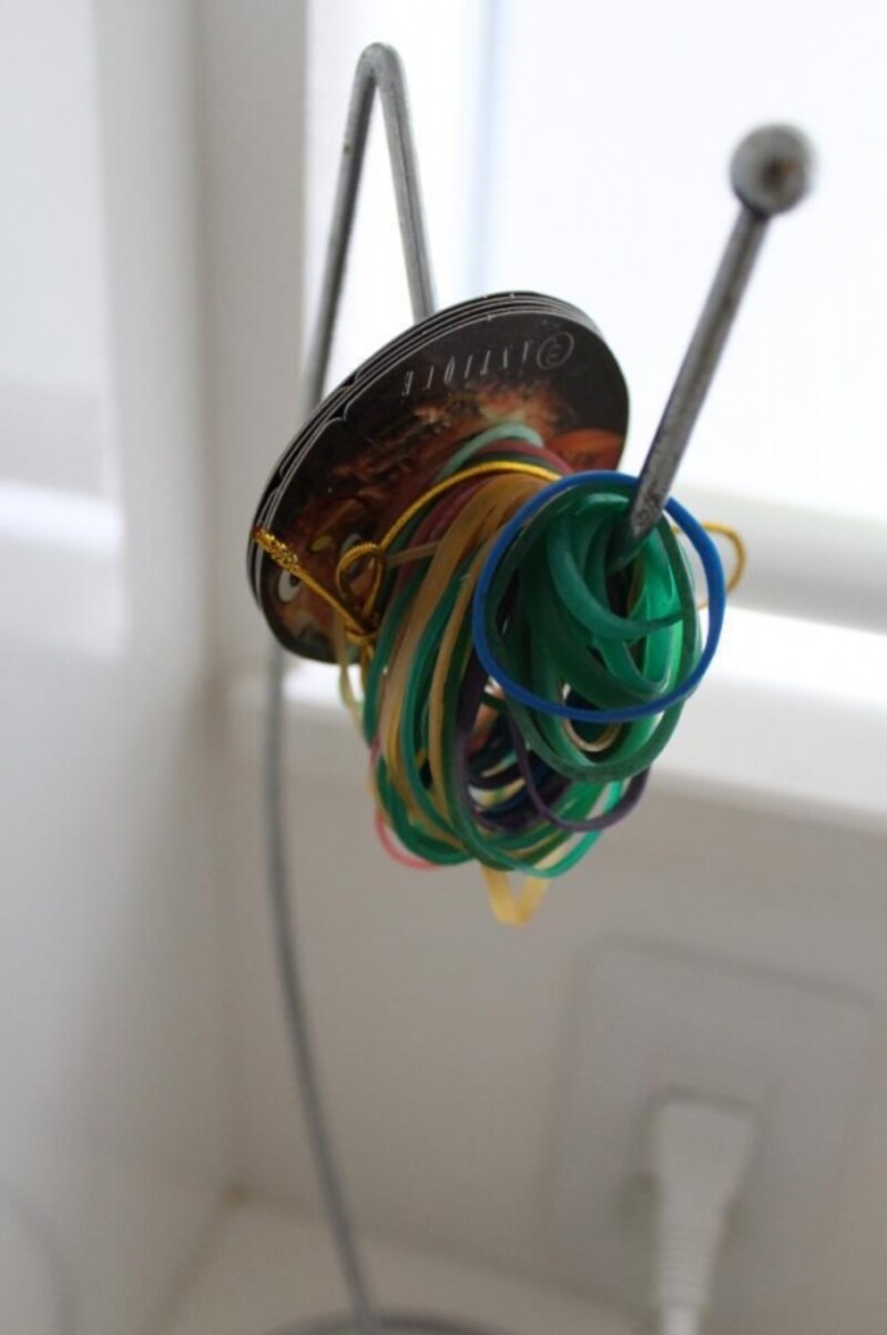 輪ゴムがかかっていると「輪ゴムかけ」の器具かと、もしかしたら見間違えてもらえるかもしれません。輪ゴムは買わずに、商品を買った時についてきた輪ゴムをここにかけているだけですが、