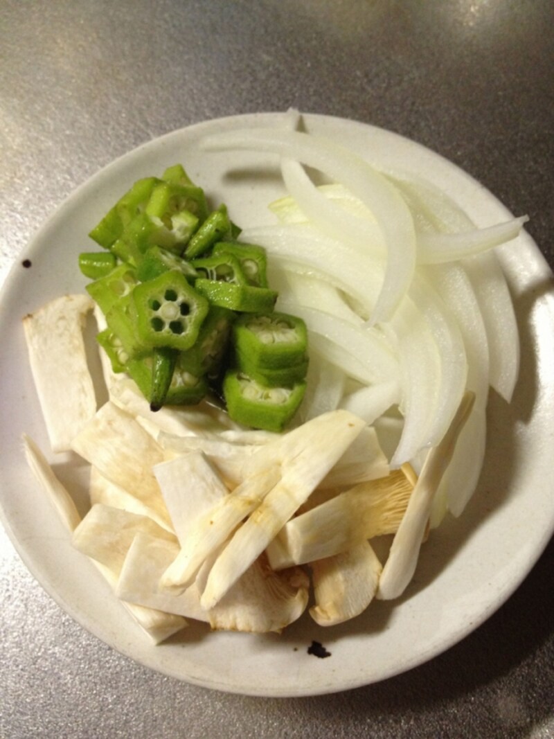 - 1.に火が通ったら、砂糖を振りかけからめたら、おくら、ポン酢を加え、よく炒める。