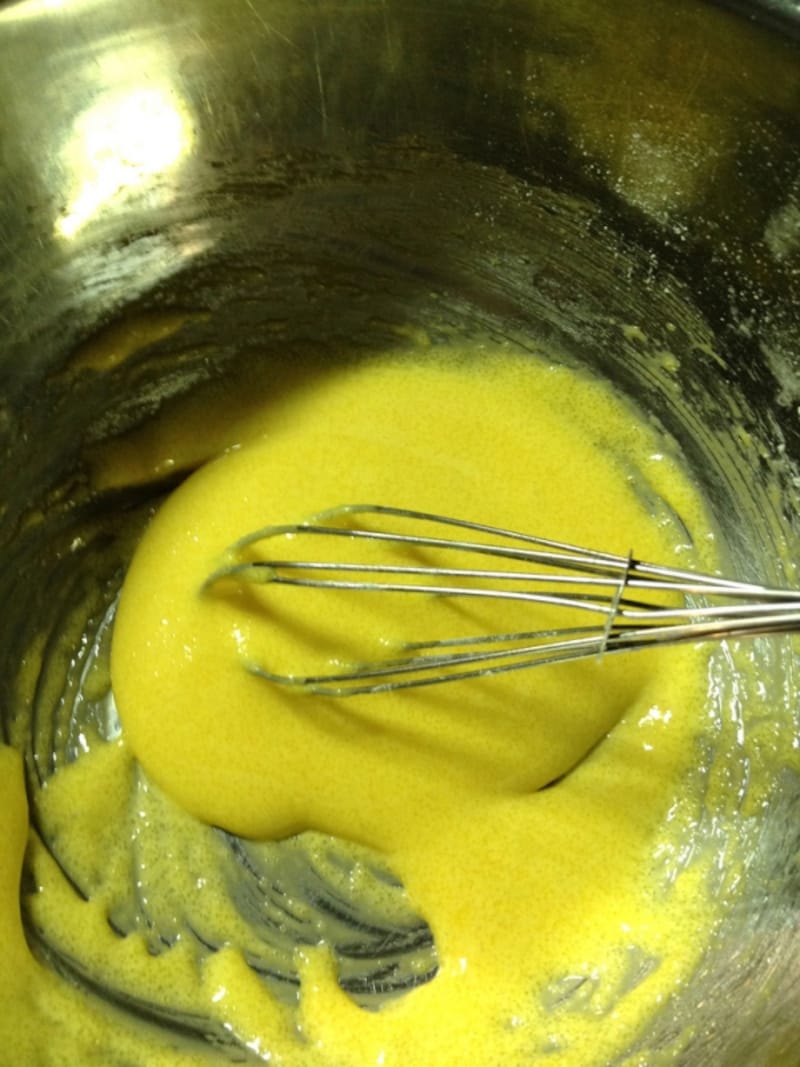 ■カスタードクリーム- 卵黄に砂糖、薄力粉を加え、よく混ぜ合わせる