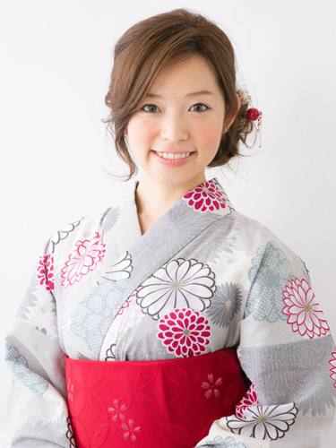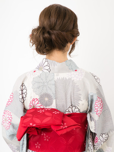 トップの丸みと、ふんわりまとめシニヨンが大人っぽいアレンジ。シニョンが耳の後ろにあるので、前からもちゃんと見え、ほどよい華やかさをプラスします。シニヨンは、ねじった毛束を複数重ねて作っているので、後ろから見ると、丸みを帯びた綱のような不思議な質感。長い髪をすっきりまとめ上げながら、柔らかいニュアンスも与える、大和撫子な浴衣スタイルです。