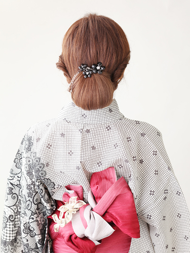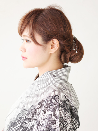 髪のツヤ感が引き立つしっとり落ち着いたおだんごは浴衣にぴったり。低めの位置でおだんごを作ると古くさく見えてしまうことがあるので、前髪を多めに作ってカジュアルダウンして、ツヤ感を出すことで女性らしさを強調。キラキラ輝くヘアアクセを付けるとツヤ感がさらにアップ。