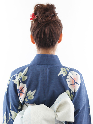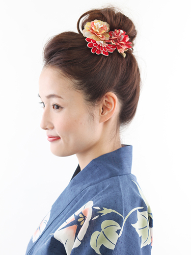 ちりめん素材のお花クリップと、つまみ細工のコームは、どれも純和風な趣。着物のなかにある一色と、アクセサリーの色みを合わせるのが使いこなしの基本です。