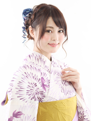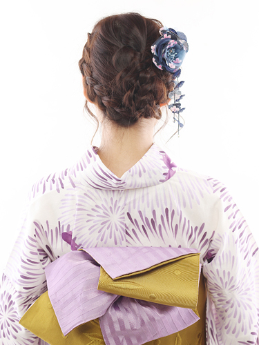 動くたび揺れる“しだれ感”のある小物を使えば、一瞬で色っぽさを演出できます。丸いフォルムのお花は女性らしさ満点。浴衣の紫と同系色でまとめて、大人っぽい雰囲気に。