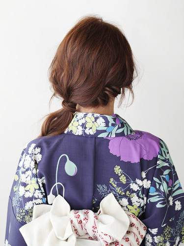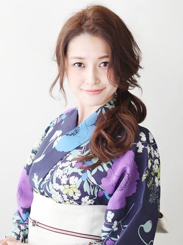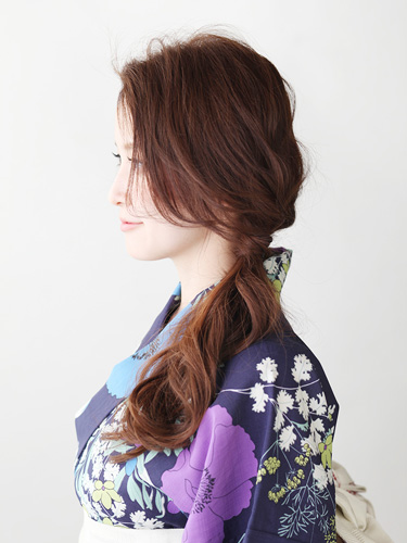 あえて目にかかるように作ったシースルーバングと、その隙間からのぞく瞳が可憐なサイドアレンジ。えり足の高さでたわませ、結び目の上にボブ風のシルエットを作ることで、大人っぽい印象になります。艶やかなイメージの浴衣に色っぽいアレンジを合わせて、ドキリとさせる佇まいが完成。