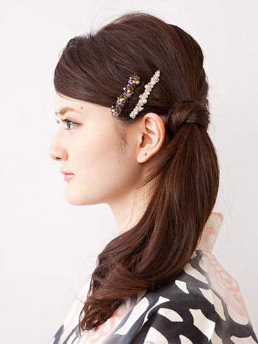 キュート系の浴衣にシックなヘアを合わせ、2つの魅力を引き出して。横広がりのシルエットは可愛い印象に傾いてしまうので、全体的に縦のラインを意識しながらまとめていくとしっとりとした雰囲気に仕上がります。アレンジがシンプルなので、飾りピンはキラキラ&2本使いでゴージャスに。