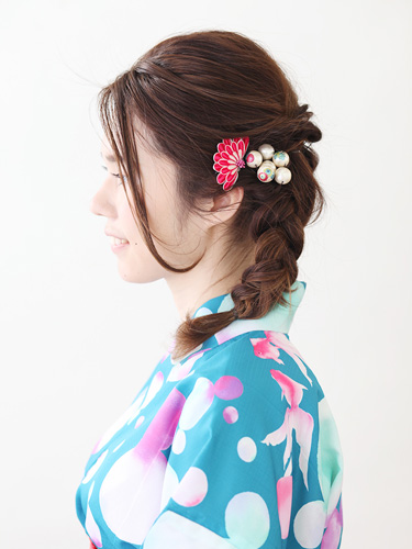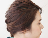 3カ所でくるりんぱし、さらにその3本の毛束で三つ編みを作った、簡単かつ崩れにくいスタイル。顔にかかるひと筋の前髪と毛流れ、半ばまで隠れた耳たぶからほんのりと色気を感じさせることで、キュートになりがちな三つ編みアレンジを大人っぽくレベルアップしています。