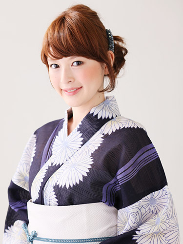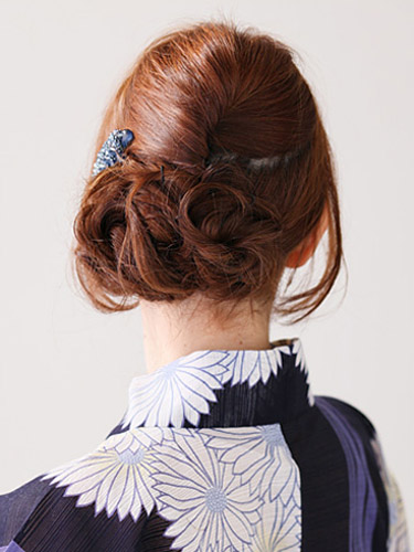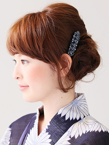 前髪とシニヨンのふんわり感で愛らしさを、ウエイト低めの位置とコンパクトなフォルムで落ち着き感を。可愛いとキレイを両方叶える欲張りアレンジです。紺色のかんざしを合わせてシックにまとめます。ヘアアクセサリーで印象がガラっと変わるので、キュートさを強調したいときには華やかなコサージュを飾って。