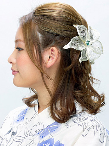 シンプルなデザインなので、頭の形をキレイに見せることが大切。トップがペタっとならないよう、最後にバランスを見ながらコームでふくらみを引きだしましょう。その時、留めた部分を押さえながら引っ張るとスタイルが崩れずに仕上がります。