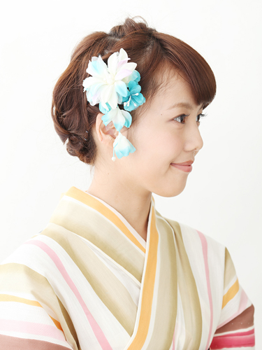 鮮やかなブルーの花モチーフのダッカール。浴衣の袖に差し色で使われたブルーをヘアアクセでも取り入れました。浴衣の差し色をヘアアクセで使うと失敗が少ないのでオススメ。