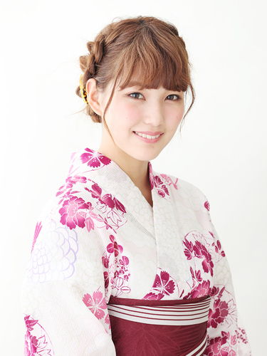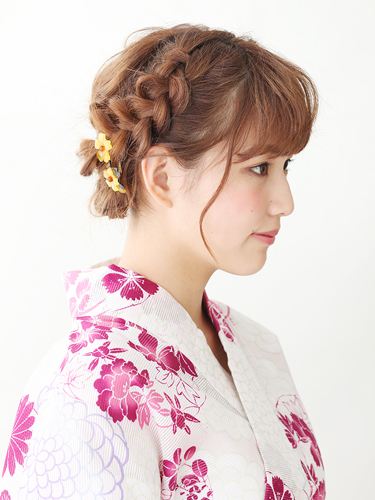 小さめの黄色の花でさりげなく上品さをプラス。全体にピンクの浴衣なので、差し色に黄色が映えます。振り向きざまに見えるように耳後ろにつけたのもポイント。