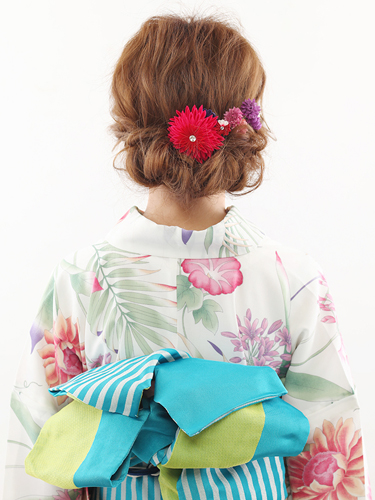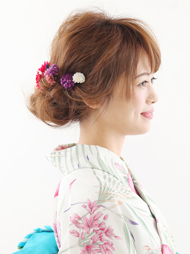つまみ細工で作ったお花のヘアクリップは、落ち着いた赤が上品で華やか。小花を集めたようなヘア小物と合わせると、花冠をつけているかのようなバックスタイルが完成します。浴衣の中に舞うお花と色味をリンクさせて、大人かわいい印象に。