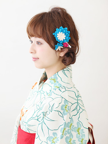 つまみ細工で作られたビビッドブルーのヘアピンと、ちりめん素材の球状モチーフが連なるUピン。可愛らしいヘアアレンジを活かしたいときにも、古典的なヘアアレンジの鮮度を上げたいときにも役立ちます。