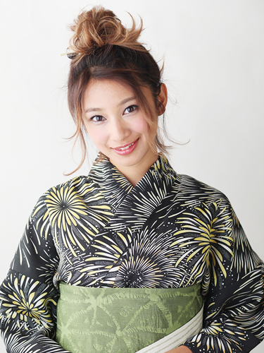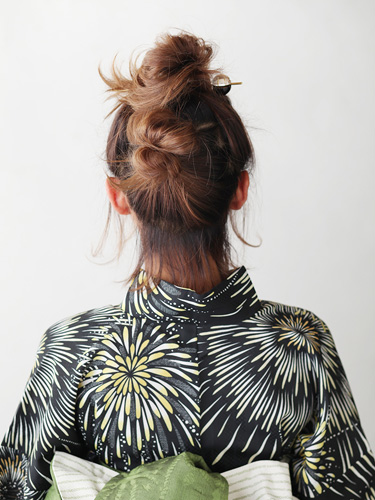 まるで頭のてっぺんに曼珠沙華(まんじゅしゃげ)の花が咲いたかのような華やかなアレンジ。一見おだんごを作っているように見えますが、実はゴムで2カ所を留めただけという簡単かつ技ありのスタイルです。艶っぽい印象に偏りすぎないよう、おでこを出しヘルシーさを加えることで、大人の余裕が生まれます。