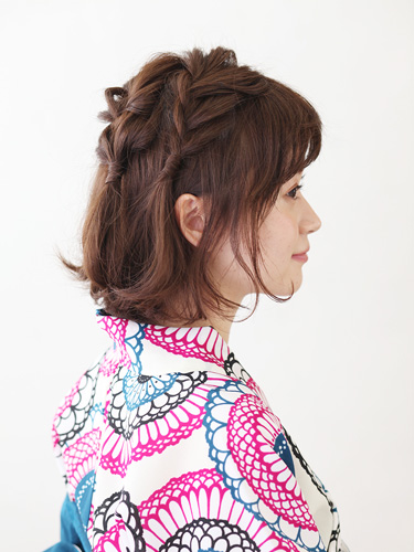 右サイドには片編み込みと両編み込み、左サイドにはねじりを加えた、リズム感のあるアレンジスタイル。センターよりも逆サイドから編み始めることでトップの高さを生み出しています。あらかじめ細いコテでしっかりと根元まで巻いておくと、アレンジの完成度が大幅にアップ。