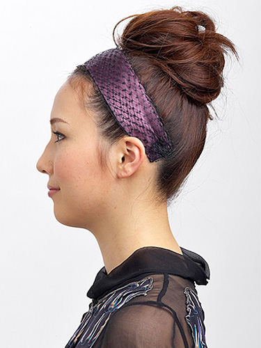 サテンと黒レースを組み合わせたエレガントなデザイン。ミステリアスな雰囲気も漂わせるパープルカラーで大人っぽく。太めのカチューシャはモードな印象を作ります。