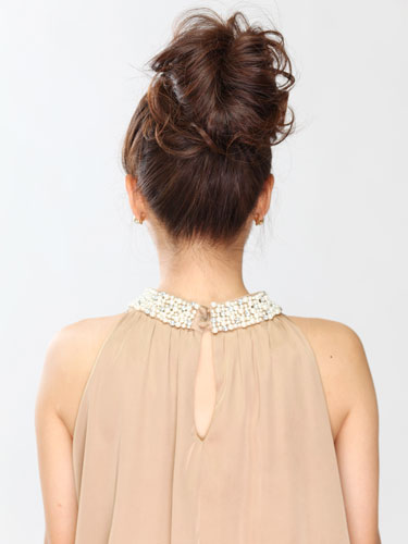 2つのポニーテールベースでふんわりとしたシニヨンを作り、ワンランク上のアレンジに。アイロンで巻くだけでなく、逆毛をしっかり立てることでふんわりとしたフォルムを完成させます。ほどよいボリューム感とカールの重なりが女性らしいアップは、360度どこから見ても美人アレンジです。