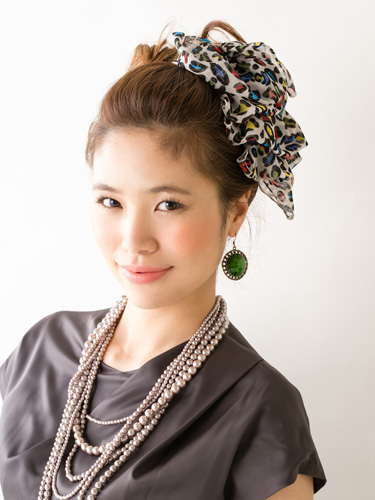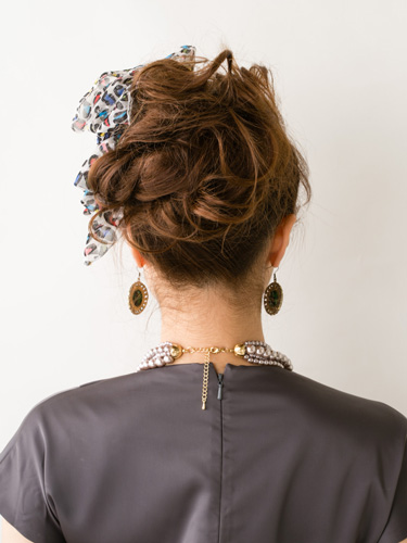 トップのふんわり感と、バックのボリューム感がゴージャスなアレンジです。毛束をいくつかに分けて、ねじり上げているので、ほどよいボリュームのカールが重なり、どこから見ても華やかです。全体的にボリュームがある分、タイトはすっきりさせるのがお約束。
