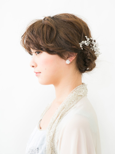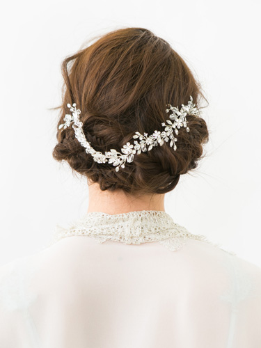 コーム付きのカチューシャ風アクセ。贅沢にあしらわれたシルバーのフラワーモチーフが華やかさをプラス。カチューシャ風に正面で使っても、今回のようにバックに使っても使い方はさまざまです。