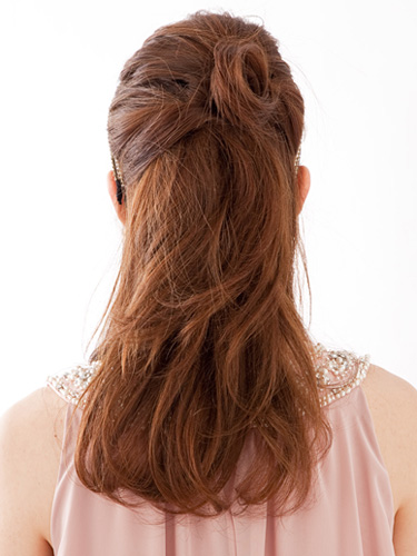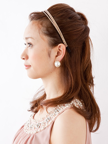 いつもよりちょっと大胆に、おでこ全開ヘアで極上の美しさをアピールしましょう。エレガントでありながら、キラキラのカチューシャでかわいらしさも感じるスタイルです。トップに高さを出しているので、気になる骨格を補正してくれる効果もアリ。ミニマムなシルエットで美オーラを放って。