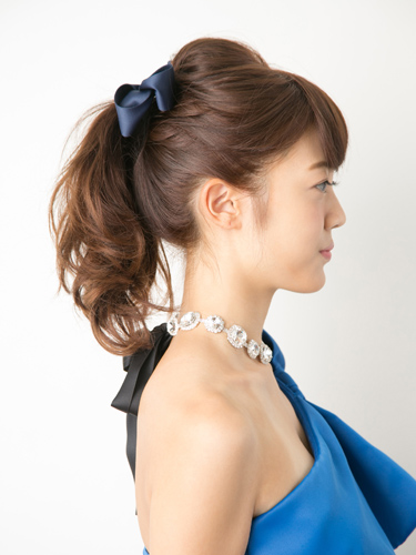 ポニーテールは結び目の位置が印象を大きく左右します。高さを出せば若々しく、低くすればカジュアルに見えるので、あごの先端と耳の端をつなぐライン上より少し低めの位置でまとめてエレガントな印象に。また、トップの高さをしっかり出して全体を縦長に仕上げると、ポニーテールがぐっと華やかなパーティモードになります。