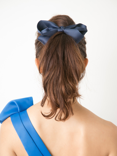 甘すぎない濃紺のリボンバレッタは大人ポニーテールにぴったり。ボリューム感に合わせて大きめのものを選ぶと好バランス。ただし、色によっては幼く見えてしまうので要注意。
