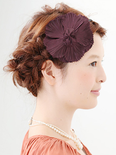 ガーリーになりがちなビックコサージュも、深みのあるパープルならエレガントな雰囲気にまとまります。軽やかなシフォン素材でできているので、存在感はありつつ重くなり過ぎないのも◎。