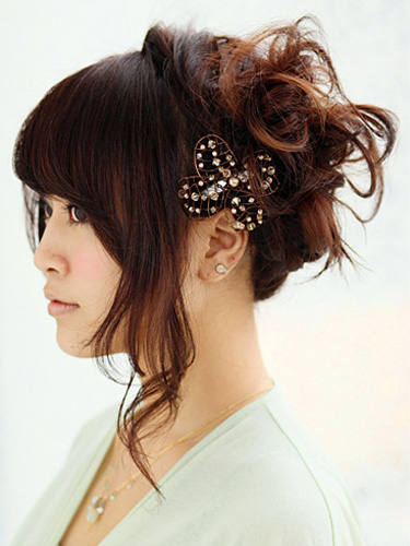 土台がしっかりしているヘアアレンジは、クリップタイプでも簡単に留まります。コサージュのような華やかさがあり、繊細なガラス細工が輝くヘアアクセは小ぶりでも存在感大。