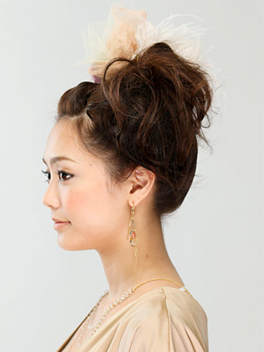 襟足をすっきり見せていさぎよくアップスタイルにすると、トップの華やかさが際立ちます。毛先のふんわり感とヘアアクセサリーの柔らかい雰囲気が絶妙にマッチ。ピアスやネックレスは大ぶりのものを選ぶと、バランスがよいでしょう。