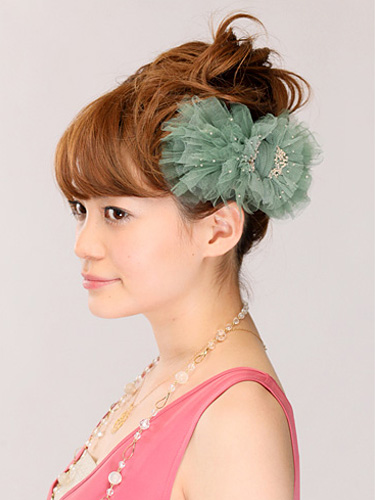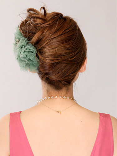 本来は飾りゴムとして使用するタイプですが、ピンで固定すればバレッタ風に留めることができて2WAYもOK。チュールを幾重にも重ねているので、大ぶりでも繊細なイメージです。