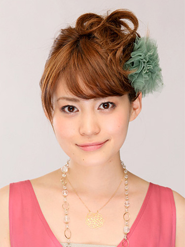 高い位置でサイドをまとめ、毛先を華やかに散らしたキュートなスタイルです。後れ毛を残さず顔周りを思い切って出すと、気になる輪郭もすっきりシャープに見えます。輪郭に視線が集中しないよう、大きめのヘアアクセを付けるとより小顔効果がUP。全体をコンパクトに作ればオフィス仕様としても。