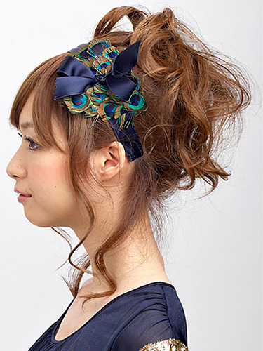 サテンのリボンにゴージャスな孔雀の羽のモチーフを組み合わせたカチューシャ。シックで大人っぽいデザインは、さまざまなドレスに合わせやすい。