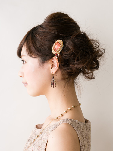 ゴールドとオレンジが華やかな飾りつきのスティックピン。ぐいっと刺すだけだから、どんなスタイルにも使いやすい。程よい大きさなので、ボリューム感のあるスタイルの、ちょっとしたアクセントに最適。