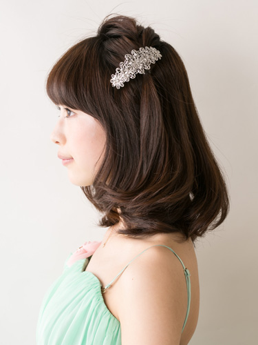 シルバーで花をあしらった、大きめサイズのバレッタ。今回のように、ダウンスタイルのシンプルなアレンジの場合、パーティらしさを出すためには、大きめ&華やかなデザインがオススメ。ゴムやピンを隠すにも便利です。